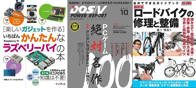 Amazon Kindleではいちばんかんたんなラズベリーパイの本、DOS/V POWER REPORT、GoodsPress、デジタルカメラマガジン、山と溪谷、ENGLISH JOURNAL、旅と鉄道、無料でWindowsが快適になる鉄板フリーソフト2017、ロードバイクの修理と整備など人気雑誌/ムックの電子書籍版を99円均一で販売する「全点99円!Kindle雑誌セール」を実施中。11月30日まで。(情報提供: クマタロウさん) →終了しました手のひらサイズのミニPC・Raspberry Piをとことん楽しむ本です。書いてあるとおりに組み立てれば完成する「ラズパイPC」の自作方法のほか、作って&使って楽しいガジェット作例もいっぱい。indowsと操作を比べて慣れて、ラズパイPCを自分のものにしましょう!
