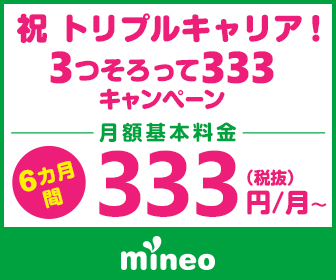 格安SIMのmineoではトリプルキャリア対応を記念して、デュアルタイプ(データ通信+音声通話)が月額基本料金333円(税抜)で6カ月間使える「祝 トリプルキャリア!3つそろって333キャンペーン」を実施中。あらかじめ税込355円のmineo エントリーパッケージを購入すると事務手数料3240円が無料(SIM発行手数料425円〜は別途必要)になるほか、さらにこのリンクから新規登録すると紹介キャンペーンの対象にもなり、1,000円分のAmazonギフト券ももれなくプレゼントされる。