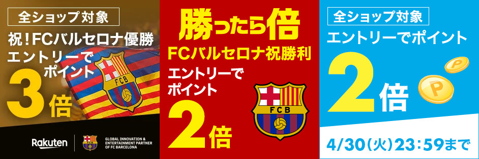 楽天市場では、祝!FCバルセロナ優勝記念 全ショップ対象エントリーでポイント3倍とFCバルセロナ 勝利記念エントリーで全ショップ対象ポイント2倍をきょう24時まで実施中。さらにあす30日24時まで48時間限定エントリーで全ショップ対象ポイント2倍も併用できるので、全部あわせてきょう24時まで楽天ショップ全ショップがポイント5倍になる大チャンス。 これに加えて対象ショップ(44,523店舗)限定15,000円以上購入で使える1,000円クーポンも配布中。楽天SPU スーパーポイントアップで最大15倍を合わせるとポイント最大19倍に。いずれも購入前のエントリーが必須なので忘れずに。