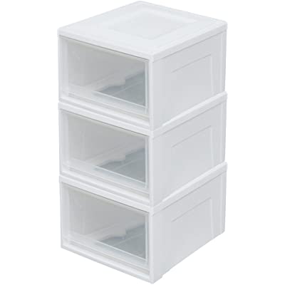 アイリスオーヤマの浅型 BCチェスト BC-M 3個セットが税込2,682円の激安超特価。送料も無料。このほかにもアイリスの収納・ペット用品・ベビー用品がお買い得(対象商品2点以上のまとめ買いで割引あり)。本日限定のセール品。ワードローブやハンガーパイプなどをかける収納の下部分にぴったりな、チェスト3個セット。引き出しが透明になっているので、収納物が見やすくて便利。衣類はもちろん、毛布やラグ・毎日使うタオルやおもちゃ・おむつにも。奥行が45cmなので、引き出しやすくスペースを有効活用でき、クローゼットにおすすめ。パイプハンガー、メタルシェルフ、ベッド下の収納にも。上段を下段に引っ掛けて固定する前倒れ防止構造で、積み重ねても使いやすい。セーターなら4枚、バスタオルなら8枚収納可能。幅35×奥行45×高さ23.2cm(引き出し内寸: 幅28.4×奥行39.5×高さ17.9cm)。