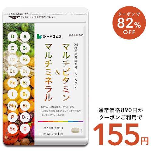 サプリ専門SHOP シードコムスのベースメントサプリ、マルチビタミン&マルチミネラル 約1ヶ月分が税込890円→155円(5.2円/日)の特価。送料も無料。735円OFFクーポン適用価格。もちろん楽天SPU スーパーポイントアップで最大17倍の対象。きょう27日までのセール品。