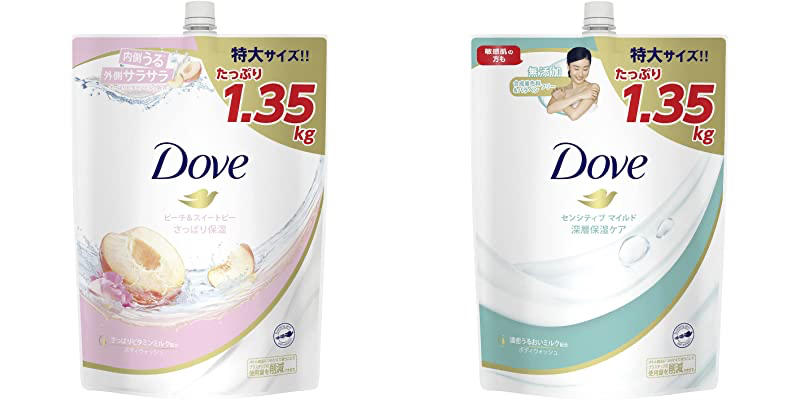Dove(ダヴ)のボディソープ ピーチ&スイートピー つめかえ用 1350gが税込1,106円→892円(定期おトク便3種15%割引適用で608円)の激安超特価。送料も無料。センシティブマイルド つめかえ用 1350gも同価格。リンク先画面内の30%OFFクーポン適用(表示されない場合は終了あるいは対象外です)&定期おトク便10%割引適用価格(定期おトク便は出荷完了後に、いつでもキャンセル可能です)。さらにユニリーバ製品税込1,000円以上購入で最大50%分ポイントバックキャンペーン(3月20日まで)も実施中。きょう20日までのセール品(早期終了する場合があります)。濃密うるおいミルクを新配合し、お肌にうるおいを届けてくれるボディウォッシュの詰め替え。さらすべな肌触りへ導いてくれるさっぱりパウダーを配合し、泡切れの良いすすぎクイック処方で汗とべたつきを簡単に洗い流せる。さらっとした洗い上がりが好きな人にぴったり。さらに肌本来が持つ、うるおいをお肌の内側に閉じ込め乾燥から守ってくれる美肌フローラにも着目。毎日のバスタイムで流れ落ちてしまいがちなこの美肌フローラを残して洗い、お肌の深層まで保湿。さっぱりしつつ保湿もできるのが魅力。天然由来のピーチエキス(整肌成分)も配合し、ほんのり甘いピーチとスイートピーの心やすらぐ香りに包まれたバスタイムを楽しめる。敏感肌の人には、微香性・合成着色料・パラベンフリーの「センシティブマイルド」がオススメ。1350gの大容量なので、家族みんなでたくさん使う人や、重たい買い物を減らしたい人にもうれしい。