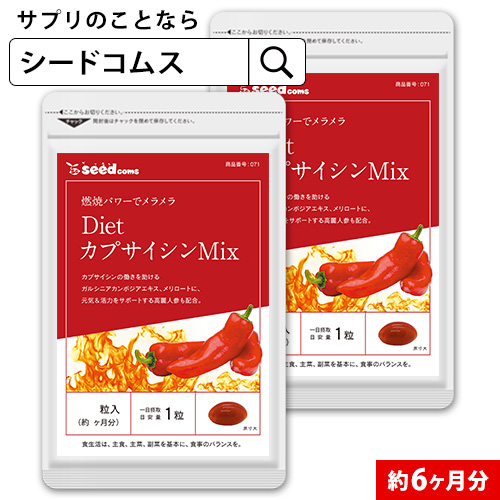 シードコムスのサプリメント、DietカプサイシンMIX サプリメント 180粒 約6ヵ月分が税込1,898円→949円(実質535円・3円/日)の激安超特価。送料も無料。3ヶ月分&1年分サプリ50%OFFクーポン適用価格(クーポンは店内他の商品にも使えます)。楽天スーパーDEAL50%ポイント還元対象商品。毎月5・10・15・20・25・30日はエントリー&楽天カード決済でポイント5倍も適用可能。もちろんお買い物マラソンのエントリー&買いまわりでポイント最大10倍と、楽天SPU スーパーポイントアップで最大16倍の対象。きょう24時までのセール品。