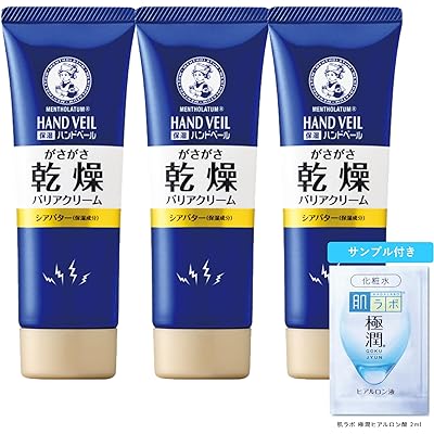 メンソレータムの薬用ハンドクリーム、ハンドベール 濃厚こってりクリーム 70g×3個がAmazonプライム会員(無料体験中でもOK)限定で税込1,002円→902円(定期おトク便3種15%割引適用で852円・284.0円/個)の特価。送料も無料(プライム会員でない方は送料がかかる場合があります)。ブラックフライデーセール価格&定期おトク便10%割引適用価格(定期おトク便は出荷完了後に、いつでもキャンセル可能です)。エントリー&期間中1万円以上購入で最大10,000pt還元ポイントアップキャンペーンも実施中。12月6日までのセール品。超乾燥肌もしっかり保湿する、薬用の高保湿ハンドクリーム。うるおいを与えるWのバター成分「シアバター」と「カカオバター」をダブルで配合。密着感の高い濃厚な塗り心地の製剤が手肌をコートし、しっかり保湿。角質層までうるおいを与えながら肌表面のうるおい膜で乾燥を防ぎ、外的刺激からお肌を守ってくれる。年中荒れがちな超乾燥肌もしっとりなめらかに整える。がさがさ乾燥肌が気になる人や、こってり濃厚な使用感が好きな人にぴったり。3個セットで届くので、自宅用・職場用・おでかけ用にできて、手を洗う度にケアできるのがウレシイ。無香料。極潤ヒアルロン液化粧水のサンプル付き。