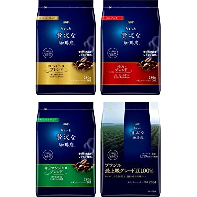 AGFのちょっと贅沢な珈琲店 レギュラーコーヒー(粉) 4種飲み比べセット 1070gが税込1,836円→1,652円(定期おトク便3種15%割引適用で1,561円・390.3円/個)の特価。送料も無料。プライム感謝祭価格&定期おトク便10%割引適用価格(定期おトク便は出荷完了後に、いつでもキャンセル可能です)。エントリー&規定額以上購入で最大12%還元ポイントアップキャンペーンも開催中。15日までのセール品。ちょっと贅沢な珈琲店のレギュラーコーヒー(粉)を4種飲み比べできるアソートセット。スペシャルブレンド280g・モカブランド280g・キリマンジャロブランド280gに加え、ブラジル最高級グレード豆100% 230gがセットになり、合計1070gの大容量。ちょっと贅沢な珈琲店シリーズは厳選した豆の特徴に合わせて丁寧に焙煎し、豆のコクと香りを最大限に引き出し、雑味のない味わいに仕上げたレギュラーコーヒー。珈琲店のマスターがハンドドリップで淹れたような、贅を尽くした奥深い味わいと香りを楽しめる。既に豆を挽いてあるコーヒー粉なので、コーヒーミルは不要。コーヒーメーカーやドリッパーを持っていれば、手軽に本格的なコーヒーを淹れることができる。気分によって違うコーヒーを飲みたい人にはもちろん、自宅やオフィスでたくさんコーヒーを飲む人にぴったり。
