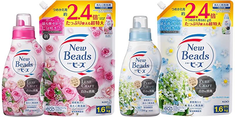 花王の柔軟剤入り洗濯洗剤、フレグランスニュービーズ リュクスクラフト ローズ&マグノリアの香り 本体780g+つめかえ1600g(計2380g)が税込1,029円→617円(定期おトク便3種15%割引適用で566円)の激安超特価。送料も無料。ミューゲ&カモミールの香りも同価格。リンク先画面内の30%OFFクーポン適用&定期おトク便10%割引適用価格(定期おトク便は出荷完了後に、いつでもキャンセル可能です)。13日までのセール品。すっきり洗い上げ、華やかな香りが咲き続ける液体洗濯洗剤。花の一生で最もきれいな瞬間の香りをブレンドした、七分咲きローズの香り。天然生花エッセンス配合、タイムアロマ製法でローズの最も華やかな瞬間の香りを捉えてブレンド。蛍光剤無配合できれいな白さ、デオドラント効果ですっきり消臭。ピュアクラフトミューゲ&カモミールの香りは、タイムアロマ製法ですずらんの最も清らかな瞬間の香りを捉えてブレンドした、五分咲きすずらんの香り。ドラム式にも使用可能で、すすぎ1回でもOK。柔軟剤入りなので、洗濯機への投入が1回で済むのがうれしい。忙しい人や、柔軟剤を別途入れるのが面倒な人にもぴったり。