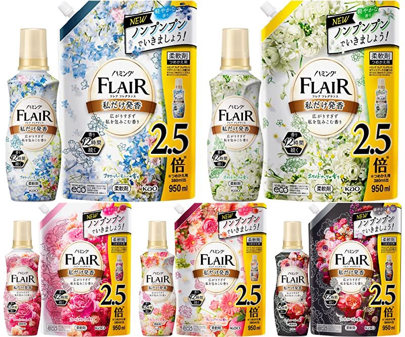 花王の柔軟剤、フレア フレグランス フラワーハーモニーの香り・ホワイトブーケの香り 本体 520ml+ 詰替え用950mlが対象者限定で税込1,051円→420円(定期おトク便3種15%割引適用で367円)の激安超特価。送料も無料。リンク先画面内の50%OFFクーポン適用&定期おトク便10%割引適用価格(定期おトク便は出荷完了後に、いつでもキャンセル可能です)。21日までのセール品。そのほかの香りにも、掲載時点では定期おトク便の設定はないものの50%OFFクーポンがあります。周囲に広がりすぎず、自然にやわらかく香る柔軟剤。ふんわり、素肌に心地いいやわらかさに。より自然にやわらかく香る独自のミネラルアロマ採用、12時間香りが続きます。私だけを包みふわっと香る「私だけ発香」で、ノンプンプンでいきましょう。抗菌・防臭効果でイヤなニオイを防ぎ、洗たくじわ・静電気も防ぐ。ふんわり、素肌に心地いいやわらかさ。爽やかなフラワーハーモニーの香り、穏やかなホワイトブーケの香り、心地よいチャーミングブーケの香り、華やかなフローラルスウィートの香り、優美なリッチフローラルの香りの5種類から選べる。