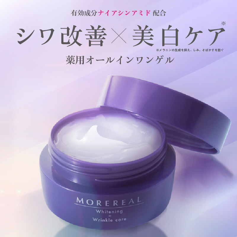 シワ改善と美白ケアがこれ1つで完了するオールインワンタイプのジェル。有効成分ナイアシンアミドがコラーゲンを作り出す繊維芽細胞の働きを活性化。コラーゲンの産生を促してシワを改善。さらにシミの素となるメラニンの生成と輸送に働きかけ、メラニンの生成を抑え、シミ・そばかすを防いでくれる。グリチルリチン酸2Kが肌荒れを防ぎ、3種類の浸透型ヒアルロン酸が角質層の隅々まで浸透してお肌の潤いを守る。ほかにも女性にうれしいポリフェノールを豊富に含んだムラサキシキブ果実エキスなど、美容・保湿成分をたっぷり配合。洗顔後はこれ1つでエイジングケアが完了するので、何種類ものスキンケアを使うのが面倒な人や、疲れているときや忙しい朝のお手入れにもぴったり。おでこや眉間などのシワが気になる人のエイジングケアに◎。