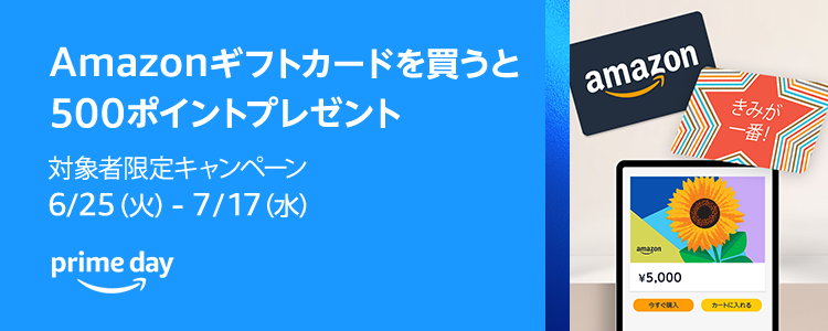Amazon.co.jpでは、Amazonギフトカード(Eメールタイプ・PDF印刷タイプ)を合計5,000円以上購入すると、Amazonで使える期間限定のポイント500円分がもらえるキャンペーンを対象者限定で実施中。7月17日まで。対象者は「キャンペーンにエントリーする」ボタンが表示された人。「キャンペーンにエントリーする」ボタンを押した後、「Eメールタイプ・PDF印刷タイプのAmazonギフトカードを期間中に合計5,000円以上購入」すると、35日以内に500ポイントが付与される(有効期限はポイントが確定される月の翌月末日まで)。エントリー前の購入や、上記以外のカードタイプやチャージタイプは対象外。対象期間中に、注文、支払い、(Eメールだけど)発送まで全部完了している必要があります。詳細はキャンペーンページで。