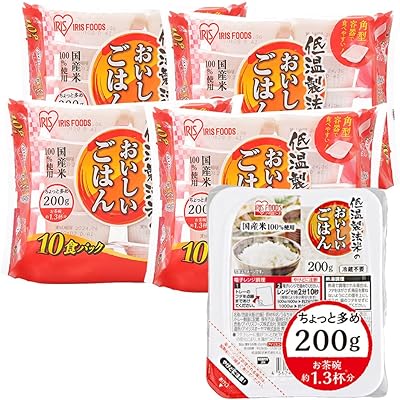 アイリスオーヤマの低温製法米のおいしいごはん 国産米100% 200g×40個が税込3,524円→3,172円(定期おトク便3種15%割引適用で2,995円・74.9円/個)の特価。送料も無料。プライムデー先行セール&定期おトク便10%割引適用価格(定期おトク便は出荷完了後に、いつでもキャンセル可能です)。エントリー&期間中1万円以上購入で最大15%還元ポイントアップキャンペーンも実施中。17日まで(?)のセール品。国産米を100%使用し、”お米”と”製法”にこだわりぬいたパックごはん。ちょっと多めのお茶碗約1.3杯分の200gパック。お米の旨みと甘みを守る最上級の精米方法「低温製法」で保管・精米し、精米直後の一番おいしいお米をそのまま炊飯・パックごはんに。先進の無菌設備と品質保持手法により、いつでも炊きたてのごはんの香りを楽しめる。低温製法は、熱に弱いα-アミラーゼが一般製法に比べて約20%多く残り、甘くおいしいごはんに炊き上がる。緑豊かな米どころ宮城の水を使用し、さらにおいしく炊き上げ。最新鋭の精米・炊飯一貫工場で、精米したての新鮮なお米を炊き上げパックごはんにすることで、いつでも新鮮でおいしいごはんを味わうことができる。お茶碗約1.3杯分の200g入りなので、たくさん食べたい人にはもちろん、少食な人なら2人でシェアできるかも。