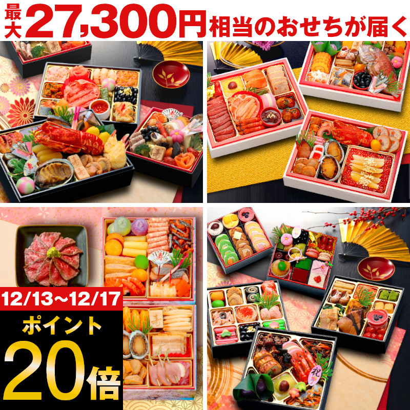 17,800円〜27,300円のおせちがランダムで届く、おせちの福袋。ボイルロブスターをはじめ、アワビ・焼鯛・かに甲羅盛り・ローストビーフなどの豪華食材に加え、百万石漬がたっぷり敷き詰められた豪華なおせち「伊達百万石」や、豪華海鮮尽くしのおせち「雲海」&食材数が豊富な個食おせち「鴛鴦」をセットにした合計4段の豪華おせちなどからランダムでどれか1つが届く。どのお店のどのおせちにするか決められない人にはもちろん、運試ししてみたい人にもぴったり。12月29日のお届け便限定で、商品お届け後にレビュー投稿が必要なモニターキャンペーン価格。商品到着までどのおせちが届くかわからず、もちろんキャンセル・返品・交換も不可なので、旅行などの予定があって不在にする人は注意。有名デパートや大手百貨店のおせちを造り続けて22年のお店のお味をリーズナブルに楽しめるのがウレシイ。