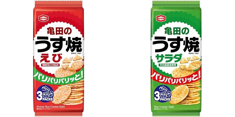 亀田製菓の亀田のうす焼えび 70g×12袋が税込1,152円→1,037円(定期おトク便3種15%割引適用で979円・81.6円/袋)の特価。うす焼サラダ 80g×12袋も税込1,282円→1,154円(定期おトク便3種15%割引適用で1,090円・90.8円/袋)の特価。送料も無料(プライム会員でない方は送料がかかる場合があります)。Amazonの初売り価格&&定期おトク便10%割引適用価格(定期おトク便は出荷完了後に、いつでもキャンセル可能です)。エントリー&規定額以上のお買い物で最大10%ポイント還元も実施中。4月1日までのセール品。香ばしい海老の風味が口いっぱいに広がるおせんべい。粗挽き仕込み製法でパリパリ食感。1967年に発売された「サラダうす焼」は、パリパリっとした軽さと香ばしさで気軽に食べられるお菓子として愛され、50年を超えるロングセラーとなった品。そのうす焼シリーズの「えび」味で、パリパリ食感とえびの風味を楽しめる。「サラダ」は、香ばしい風味のあっさり塩味を楽しめる。どちらも小分けで便利な3パック入りで食べ切りやすいのが魅力。いつでもパリパリのおせんべいを食べたい人にぴったり。お酒のおともにも◎。