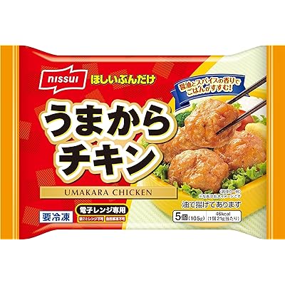 ニッスイの冷凍食品、ほしいぶんだけ うまからチキン 5個入 105g×6袋が税込1,522円(253.7円/袋)の特価。送料も無料(保冷手数料も無料)。エントリー&規定額以上のお買い物で最大10%ポイント還元も実施中。→終了しましたやわらかな若鶏のもも肉を使用した、ごはんによく合うお弁当向けのから揚げ。ニッスイ独自の「ふっくら漬け込み技術」で、やわらかく冷めてもジューシーな食感、さらに独自技術「香りUP製法」で、香りを引き立させました。濃口しょうゆ・粉末しょうゆの2種類のしょうゆと、4種のスパイスを使用した、ごはんに合う味付けに仕上げた品。ほしいぶんだけお弁当箱に詰めて。