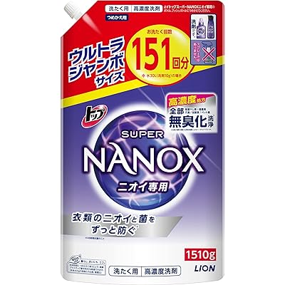 ライオンの洗濯洗剤、スーパーナノックス 液体洗濯洗剤 つめかえ ウルトラジャンボサイズ 1510gが税込1,131円→565円の特価。Amazonプライム会員(無料体験中でもOK)または2,000円以上購入で送料も無料。リンク先画面内の50%OFFクーポン適用価格。いつもちゃんとお洗濯しているのに、白いシャツや肌着が、だんだん黄ばんだり、黒ずんだりしてくること、あきらめていませんか?スーパーナノックスで、衣類ではなく繊維1本1本から徹底クレンジング。 センイ1本1本から汚れを徹底的に落とす、新開発のスーパーナノ洗浄。新成分LO(リフトアウト)を配合し、繊維にしみつこうとする皮脂汚れなどを繊維から浮かび上がらせ、独自の洗浄成分MEEで繊維から黄ばみ・黒ずみの原因となる汚れをナノレベルに分解して落とす。面活性剤の種類、配合比率など、組成を大幅に変更し、洗浄力と共に再汚染防止機能を強化。汚れ残りゼロへ。泡切れがよく、すすぎ1回のお洗濯に適しています。通常の4.3倍入った、たっぷり使える超特大つめかえ1510gで、洗濯151回分(水量30Lの場合)。子どもがいる家庭など、洗濯物がいっぱいある家におすすめ。