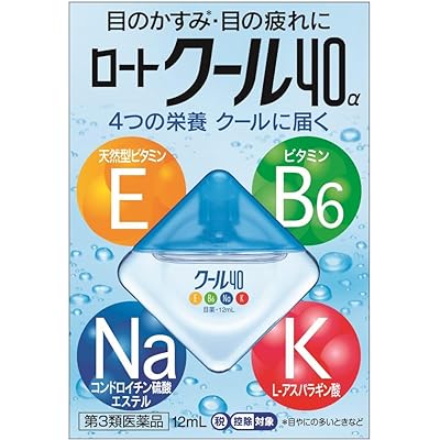 ロート製薬の目薬(第3類医薬品)、ロートクール40α 12mlが税込196円の特価。Amazonプライム会員(無料体験中でもOK)または3,500円以上購入で送料も無料。目に大切な4つの栄養素を直接与え、目の疲れ・目のかすみ等を効果的に改善する目薬。「天然型ビタミンE」が血行を促し、目の疲れを緩和。「ビタミンB6」が目の細胞の代謝を促し、疲れ目を改善します。また、「コンドロイチン硫酸エステルナトリウム」が目の角膜表面を保護し眼病を予防。さらに「L-アスパラギン酸カリウム」が、目に酸素を取り込んで目の疲れを癒します。スーッと冷たい清涼感の目薬です。