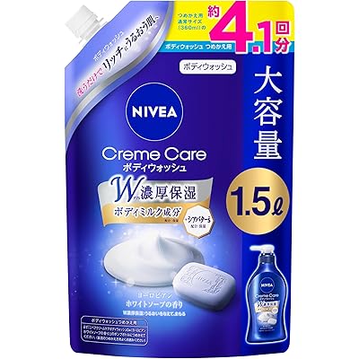 ニベアのクリームケア ボディウォッシュ ヨーロピアンホワイトソープの香り 大容量つめかえ 1500mlがAmazonプライム会員(無料体験中でもOK)限定で税込1,210円→1,089円(定期おトク便3種15%割引適用で1,028円)、3個まとめ買いで税込3,630円→2,904円(定期おトク便3種15%割引適用で2,722円・907.3円/個)、4個まとめ買いで税込4,840円→3,630円(定期おトク便3種15%割引適用で3,388円・847円/個)の特価。の特価。送料も無料。プライムデー先行セール価格&定期おトク便10%割引適用価格(定期おトク便は出荷完了後に、いつでもキャンセル可能です)。エントリー&期間中規定額以上購入で最大5,000pt還元ポイントアップキャンペーンも実施中。14日までのセール品。洗うたびしっとりツヤ肌へと導く、W濃厚保湿のボディウォッシュ。ボディミルク成分とシアバターを配合し、まるでクリームのような濃厚な泡で、素肌のうるおいをまもりながらやさしく洗い上げる。すっきり洗い流せるのにしっとり潤い、洗った後もボディミルク成分が残り、しっとりが続く。ヨーロピアンホワイトソープの香り。たっぷり4.1回つめかえできるので、家族みんなで使えるのがウレシイ。
