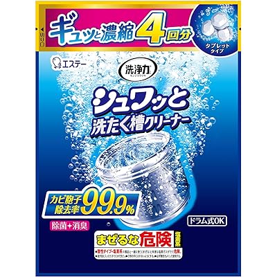 エステーの洗浄力 シュワッと 洗たく槽クリーナー タブレット個包装タイプ(4回分)が税込709円→638円(定期おトク便3種15%割引適用で603円・150.8円/個)の特価。送料も無料。他店最安値は3個で実質549円(183円/個)[価格比較サイトで相場チェック]。プライムデーセール価格&定期おトク便10%割引適用価格(定期おトク便は出荷完了後に、いつでもキャンセル可能です)。エントリー&期間中1万円以上購入で最大15%還元ポイントアップキャンペーンも実施中。17日までのセール品。タブレットをポンと入れて洗濯機を回すだけで洗たく槽カビに効く、タブレットタイプの洗たく槽クリーナー。つけおき不要でシュワッと溶けるタブレットタイプ。固形でも残らずにシュワッと溶けて洗浄成分が炭酸泡とともにすみずみまで広がり、洗たく槽の裏側まですばやく浸透、洗たく槽内の汚れを一掃してくれる。カビ胞子除去率99.9%で カビや菌をしっかり除去し、気になるニオイをスッキリ消臭。洗浄成分をギュッと濃縮しているので、従来の液体タイプに比べ約1/8コンパクト。ドラム式・縦型全自動洗濯機(二層式を除く)のどちらタイプでも使える。