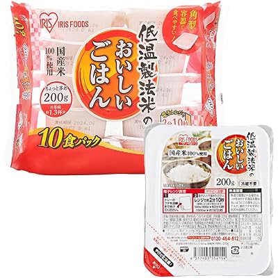 アイリスオーヤマの低温製法米のおいしいごはん 国産米100% 200g×10個が税込982円(98.2円/個)の特価。Amazonプライム会員(無料体験中でもOK)または3,500円以上購入で送料も無料。国産米を100%使用し、”お米”と”製法”にこだわりぬいたパックごはん。ちょっと多めのお茶碗約1.3杯分の200gパック。お米の旨みと甘みを守る最上級の精米方法「低温製法」で保管・精米し、精米直後の一番おいしいお米をそのまま炊飯・パックごはんに。先進の無菌設備と品質保持手法により、いつでも炊きたてのごはんの香りを楽しめる。低温製法は、熱に弱いα-アミラーゼが一般製法に比べて約20%多く残り、甘くおいしいごはんに炊き上がる。緑豊かな米どころ宮城の水を使用し、さらにおいしく炊き上げ。最新鋭の精米・炊飯一貫工場で、精米したての新鮮なお米を炊き上げパックごはんにすることで、いつでも新鮮でおいしいごはんを味わうことができる。お茶碗約1.3杯分の200g入りなので、たくさん食べたい人にはもちろん、少食な人なら2人でシェアできるかも。