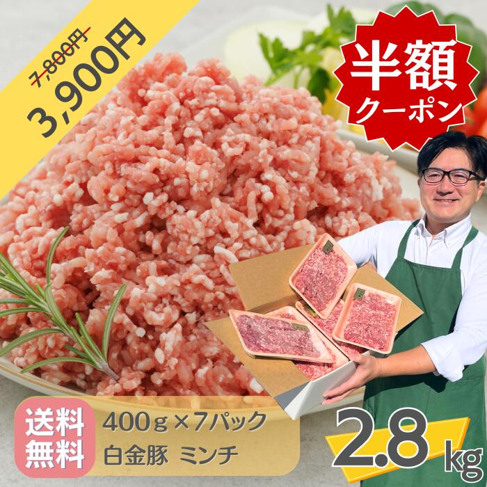 白金豚プラチナポークの白金豚 挽肉 ミンチ 2.8kg(400g×7パック)が税込7,800円→3,900円(139.3円/100g)の特価。送料も無料。50%OFFクーポン適用価格。ヴィッセル神戸勝利 エントリーで全ショップポイント2倍、サンキューショップ限定エントリー&3,980円以上購入でポイント2倍も適用可能。もちろんお買い物マラソンのエントリー&買いまわりでポイント最大10倍と楽天SPU スーパーポイントアップで最大17倍の対象。きょう20時からのセール品。