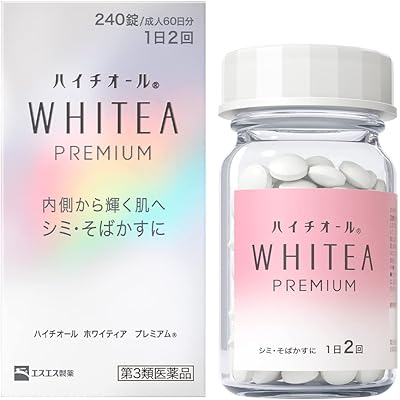 エスエス製薬のビタミンC主薬製剤(第3類医薬品)、ハイチオール ホワイティア プレミアム 240錠 成人60日分が税込2,651円(44.2円/日)の特価。Amazonプライム会員(無料体験中でもOK)または3,500円以上購入で送料も無料。無色化・抑える・出す・移さない、4つの作用でシミを緩和、シミにも隠れジミにも効果を発揮する医薬品。L-システインが低下している肌の代謝(ターンオーバー)をサポート。L-システイン、ビタミンB6、ビタミンCが、からだの内側から肌に働きかけ、シミ・そばかすなどの色素沈着を緩和します。肌の奥で増す過剰なメラニンの生成や過剰なメラニンの蓄積を抑制。肌の代謝を助け、メラニンのスムーズな排出を促進。さらに肌に沈着してしまった黒色メラニンの色を薄くします。