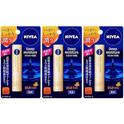ニベアのディープモイスチャーリップ はちみつの香り 3本セットが税込1,010円→909円(定期おトク便3種15%割引適用で858円・286.0円/本)の特価。無香料 3本セットも税込1,020円→918円(定期おトク便3種15%割引適用で867円・289.0円/本)の特価。送料も無料(プライム会員でない方は送料がかかる場合があります)。タイムセール価格&定期おトク便10%割引適用価格(定期おトク便は出荷完了後に、いつでもキャンセル可能です)。ひと塗りでしっかり潤う高保湿リップクリーム。高保水型持続ヴェール処方でうるおいが瞬時に広がり、唇の体温でとろけて密着しつづける。有効成分(ビタミンE・グリチルレチン酸ステアリル)が、唇の荒れ・ひび割れを防ぐのと同時に、5つの保湿成分(はちみつ、ローヤルゼリーエキス、トレハロース、ホホバオイル、スクワラン)がデリケートな唇ををしっかりカバーして潤いを与えてくれる。UVカット成分配合(SPF20/PA++)も配合でアウトドアのおともや、毎日の紫外線対策にもぴったり。潤いが長時間持続するので、1日に何度もリップクリームを塗り直すのが面倒な人や、乾燥が気になる人にもオススメ。