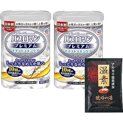 アース製薬の入浴剤、バスロマン プレミアム モイストスキンケア 600g×2+おまけ(温素琥珀の湯1包)が税込1,279円→767円(定期おトク便3種15%割引適用で703円・351.5円/個)の特価。送料も無料(プライム会員でない方は送料がかかる場合があります)。リンク先画面内の30%OFFクーポン適用&定期おトク便割引適用価格(定期おトク便は出荷完了後に、いつでもキャンセル可能です)。13日までのセール品。→[1/13追記:クーポンが復活しています]10種の美容液成分(保湿成分)を厳選配合した、たっぷりうるおい、しっとりなめらか肌へと導く入浴剤。プラセンタ・ヒアルロン酸・ミルクプロテイン・シアバター・ローヤルゼリー・シルク末;コラーゲンなどの保湿成分を配合し、うるおい溶けこむ極上の湯ざわりでしっとりなめらか肌へ。有効成分が温浴効果を高め血行を促進し、肌荒れ・しっしんに効果的。さら湯のピリピリ感をやわらげる塩素除去成分とお肌しっとり天然カミツレエキスも配合。赤ちゃんと一緒に入浴する時も使えます。とろりとした湯ざわりとバニラフローラルの香りが、おうちのお風呂を最高のリラックス空間にしてくれる。乾燥する季節、背中カユカユになる民にも福音となりそう。試しちゃう?