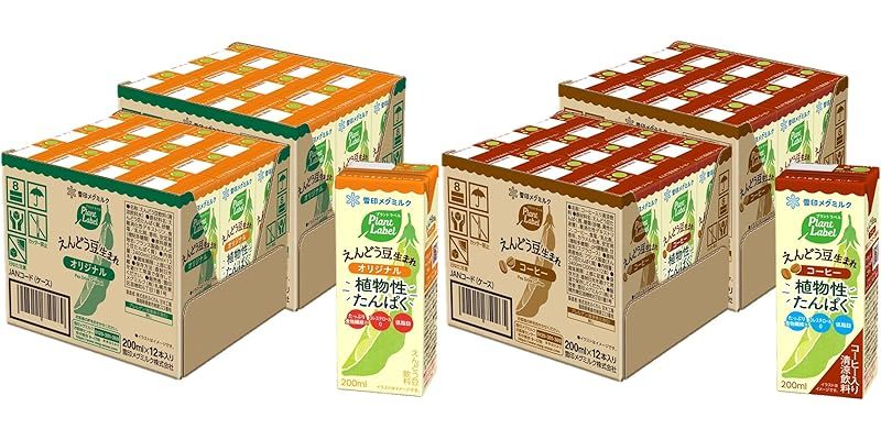 雪印メグミルクのPlant Label(プラントラベル) えんどう豆生まれ オリジナル 200ml×24本が税込1,543円→694円(28.9円/本)の特価。Plant Label えんどう豆生まれ コーヒー 200ml×24本も税込1,578円→710円(29.6円/本)の特価。送料も無料。Amazonプライム会員(無料体験中でもOK)限定セール&リンク先画面内の50%OFFクーポン適用(表示されない場合は終了あるいは対象外です)&定期おトク便5%割引適用価格(定期おトク便は出荷完了後に、いつでもキャンセル可能です)。2日までのセール品。えんどう豆たんぱくを使用した、プラントベース飲料。植物由来の原料からつくられる食品、プラントベースフード。大豆やアーモンドと比べて、生産過程で水使用量やCO2の排出量がとても少なく、アーモンドやオーツなどの植物性原料と比較してたんぱく質や食物繊維の量が多く、脂質の量が少ないことが特徴。もちろんコレステロール0。ほのかな豆の味わいが感じられ、毎日続けやすい風味の"オリジナル"と、香ばしいコーヒーの味わいが感じられる風味の"コーヒー"の2種類から選べる。