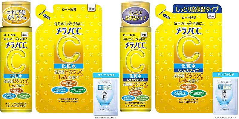 ロート製薬のメラノCC 薬用しみ対策美白化粧水 本体170mL+つめかえ170mLがAmazonプライム会員(無料体験中でもOK)限定で税込1,456円(定期おトク便3種5%割引適用で1,383円)の特価。しっとりタイプ 本体170mL+つめかえ170mLも同価格。送料も無料。プライムデー先行セール価格&定期おトク便割引適用価格(定期おトク便は出荷完了後に、いつでもキャンセル可能です)。エントリー&期間中規定額以上購入で最大5,000pt還元ポイントアップキャンペーンも実施中。14日までのセール品。ロート製薬が"効き目"にこだわって開発した、しみ予防美白化粧水。高浸透ビタミンC誘導体など、美白有効成分が角質層まで浸透し、メラニンの生成を抑え、しみ・そばかすを防ぐ。お肌にうるおいを与えながら、透明感のあるお肌へと導いてくれる。抗炎症成分も配合し、ニキビ痕や毛穴が気になるお肌にもアプローチ。スポーツ、アウトドアなど、レジャーでの日焼けが気になる人や、毎日の紫外線によるうっかり日焼けが気になる人にもオススメ。日焼けしてしまったあとにたっぷりと肌に染み込ませてクールダウンに使用すれば、ほてりを抑える効果も期待できる。爽やかな柑橘系の香りも癒してくれそう。リーズナブルなので、量を気にせずたっぷり使えるのもウレシイ。紫外線が気になる今の季節にぴったり。