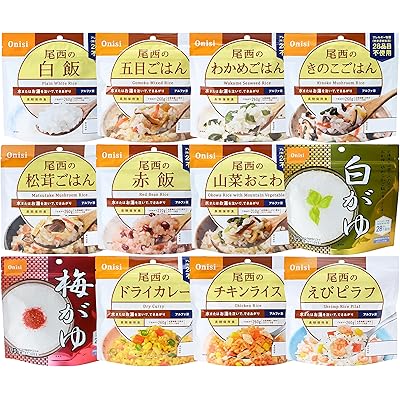 尾西食品のアルファ米12種類全部セットが税込4,061円→3,452円(定期おトク便3種5%割引適用で3,249円・270.8円/食)の特価。送料も無料(Amazonプライム会員でない方は送料がかかる場合があります)。リンク先画面内の15%OFFクーポン適用&定期おトク便割引適用価格(定期おトク便は出荷完了後に、いつでもキャンセル可能です)。ポイントアップキャンペーン(要エントリー)も実施中。11月24日までのセール品。お湯または水だけでふんわりご飯ができあがる、12種類の味が楽しめるアルファ米全部セット。注水線までお湯を注ぎ、待つこと15分(水なら60分)でふんわりご飯ができあがり。セットには計量カップが1つ付いているので、誰でも美味しく作ることができる。スプーン付きだから、食器がなくても何処でも食べることができて、キャンプやバーベキューなどのアウトドアシーンはもちろん、賞味期限がたっぷり5年(*)もあるので災害時・停電時の備蓄食料にもぴったり。ご飯が恋しくなる海外旅行のおともにもオススメ。白飯・赤飯・山菜おこわ・五目ごはん・わかめごはん・きのこごはん(旧:田舎ごはん)・ドライカレー・チキンライス・えびピラフ・松茸ごはん・白がゆ・梅がゆの12種類(※セット内容は変更される場合があります)。どれから食べる? (*)松茸ごはんのみ5年を切っている商品が含まれる場合あり