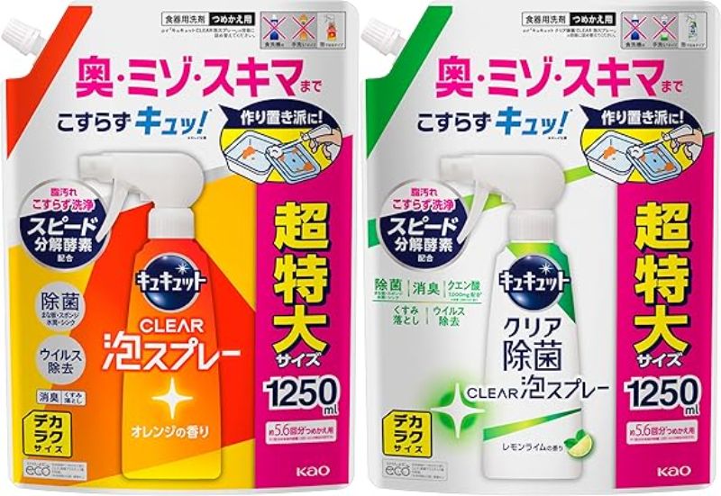 花王の食器用洗剤、キュキュット クリア泡スプレー つめかえ用 デカラクサイズ 1250ml オレンジの香りが税込492円→443円(定期おトク便3種15%割引適用で418円)の特価。クリア除菌 レモンライムの香りも同価格。送料も無料。プライム感謝祭先行セール価格&定期おトク便10%割引価格(定期おトク便は出荷完了後に、いつでもキャンセル可能です)。エントリー&規定額以上購入でポイントアップキャンペーンも実施中。10日までのセール品。スプレーして流すだけ!こすってもこすってもスポンジでは届かない、キッチンツールや汚れにスプレーするだけでスッキリ落とせる食器用洗剤の詰め替え用。洗う前にシュッとつけ置きしておけば、たっぷりの泡がジュワワッと油を吸いとる。シンクの水垢もスッキリ落としてピカピカに。今まで洗いきれなかったミゾ・奧・スキマの汚れもスプレーして流すだけで、すみずみまで清潔に。はし&はし箱に、お弁当箱の四隅のヌルヌルに、水筒のフタや底に、スープジャーの奥やミゾに、シリコンカップのギザギザの油汚れに。香りはオレンジの香りと無香性、さらに除菌泡タイプの微香性グレープフルーツの香りとレモンライムの香りからそれぞれ選べる。