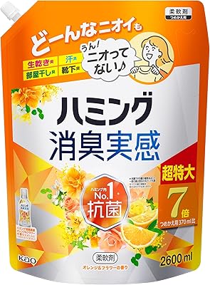花王の柔軟剤、ハミング 消臭実感 超特大7倍 つめかえ 2600ml オレンジ&フラワーの香りがAmazonプライム会員(無料体験中でもOK)限定で税込1,080円→864円(定期おトク便3種15%割引適用で810円)の特価。送料も無料。リンク先画面内の対象者限定10%OFFクーポン適用&プライム感謝祭セール価格&定期おトク便10%割引価格(定期おトク便は出荷完了後に、いつでもキャンセル可能です)。エントリー&規定額以上購入でポイントアップキャンペーンも実施中。10日までのセール品。2種類の消臭成分を配合し、動くたびに消臭、さらに汗をかくたびに2段階で消臭する柔軟剤。動いたときや汗をかいたときなど、ニオイが気になるシーンで何度でも消臭してくれるので、衣類を着ているあいだじゅう消臭を実感できる。24時間抗菌効果のほか、衣類の生乾き臭・汗臭・加齢臭・靴下臭にも対応。部屋干しすることが多い人にもうれしい。花粉を寄せ付けないブロック効果も。つめかえ用約7倍の超特大サイズなので、洗濯物が多い家庭や、重たい買い物を減らしたい人にもぴったり。※旧パッケージが発送される場合があります。